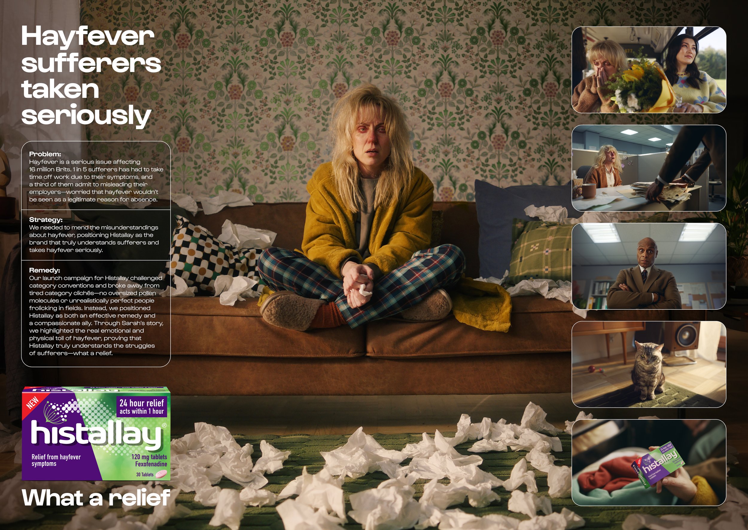 Poor Sarah. She’s got a head like a washing-machine and a used tissue pile taller than Kilimanjaro. Hayfever is wreaking havoc on her day and not even her cat is capable of sympathy. It’s “just a case of the sniffles,” right? Wrong. It’s a debilitating nightmare! Our first campaign for our new client, Histallay, finally offers some sympathy to the nation’s hayfever sufferers as well as an effective remedy. What a relief.